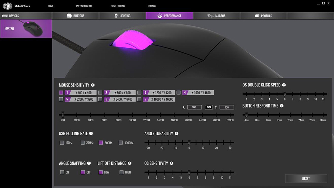 Cooler Master uses their MasterPlus+ software to control the MM731’s DPI button, lighting, performance, macros, and profiles as seen in some of the screenshots below. There’s so much that one can do with this software.