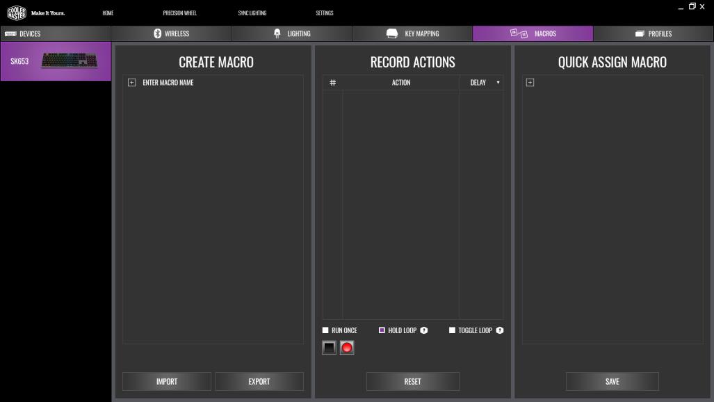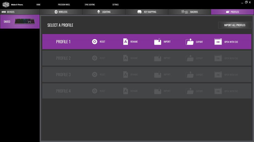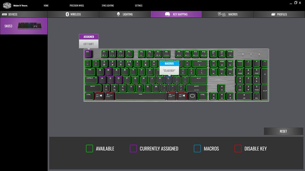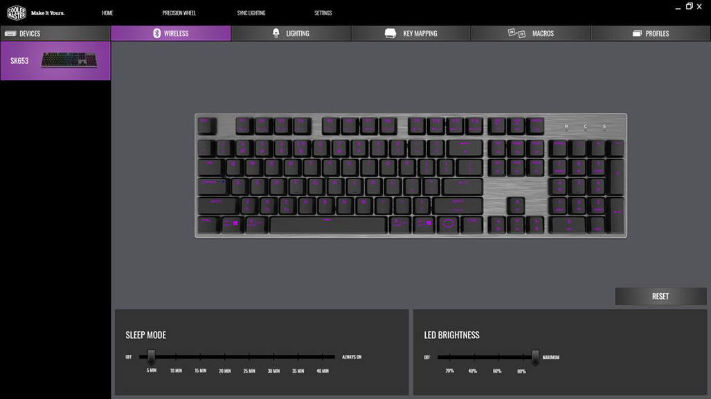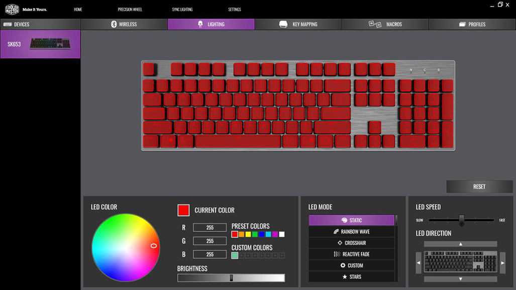 Cooler Master uses their MasterPlus+ software to control the SK653’s wireless, lighting, keymapping, macros, and profiles as seen in the five screenshots below. For instance, LED modes and speeds are adjustable and customizable via the MasterPlus+ software. A lot of high-quality colors radiate from this keyboard.