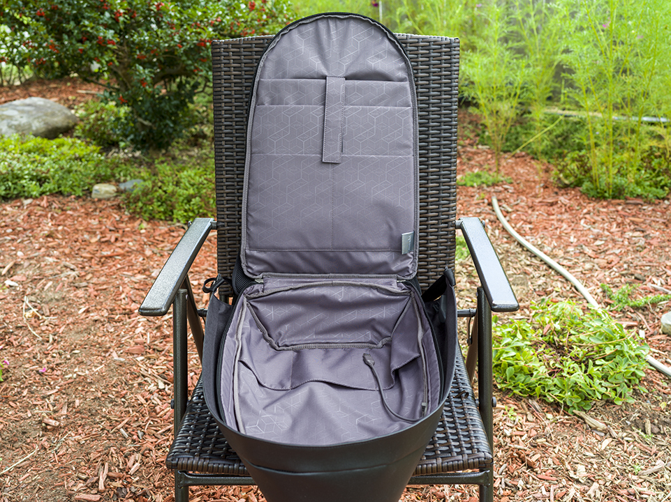 Like any other backpack, there are two sides. One side contains two adjustable straps, the lower of which has a pocket for the holding the largest of water bottles. Better yet, you can slide something like an umbrella or tripod through and have your drink container snug.