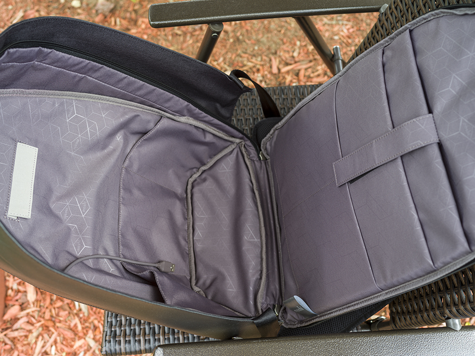 The next two compartments are within the bag’s opening. First, there’s the thickly padded 13″ MacBook Pro compartment which protects your pricey tech in the event of a drop. Opposite to the padded compartment is a zippered pocket for your most sacred items, i.e., wallet, passport, etc., plus a few sleeved pockets for items like a pen, a toothbrush, USB cables, or a power charger like the Moshi IonBank 5K.