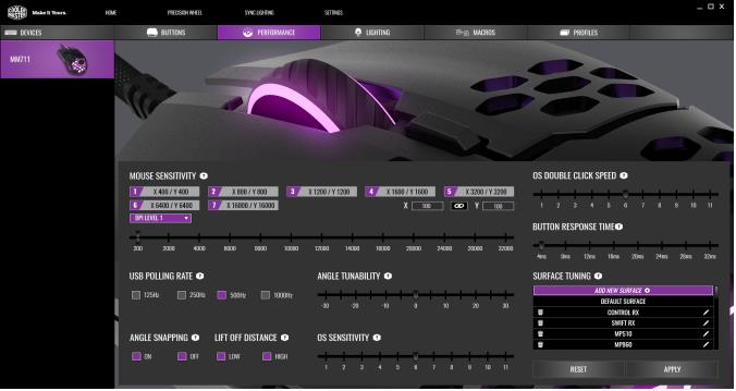 Cooler Master uses their MasterPlus+ software to control the MM711’s DPI button, lighting, performance, macros, and profiles as seen in the screenshots below. There’s plenty one can do with this software.